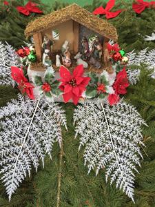 This Fresh Balsam Blanket is Adorned With a Manger and Hand Painted Figurines, Poinsettias, Velvet Bows and More
