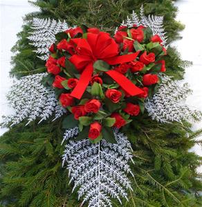 Fresh Balsam Blanket Decorated With a Beautiful Heart of Red Roses, Green and White Holly, Fern and Velvet Bows