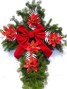 Fresh Pine Cross, Decorated with Poinsettias, Fern, and Velvet Bows